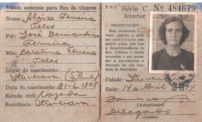 Saldo conduto para viagem, de Alzira Ferreira Telles, tirado em 14 de abril de 1944, quando o mundo vivia a Segunda Guerra Mundial. Ela nasceu dia 21 de junho de 1898, filha de José Bernardino Ferreira e Carolina Ferreira Telles, casada com Franklin Ferreira de Meneses, e são seus filhos: Aníbal Ferreira Telles, casado com Luiza Moura Telles; Tonilia Ferreira de Paula, casada com Hormísio de Paula Silveira; Adélia Telles de Paula, casada com Anízio de Paula Santos; Asquepíbades Ferreira Lino, casada com Alceu Lino; Maria José Ferreira Chiconeli, casada com Ernesto Chiconeli Filho; Arnaldo Ferreira Telles, casado com Araci Sampaio Telles; José Ferreira Menezes (Ferreirinha), casado com Maria Aparecida da Costa Menezes (“Cidinha do Ferreira”); João Batista de Menezes Neto (“João Abacaxi”), casado com Vilma Barcelos de Menezes; Iolanda Ferreira Fonseca, casada com Sebastião Furquin Fonseca e Zélia de Menezes Germano, casada com Waibe Germano (“Bibi Germano”).