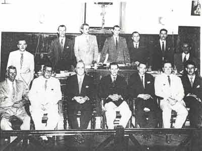 Câmara Municipal no período legislativo 1956/1959, que era composta por 15 vereadores. (1) o secretário Moacyr França, (2) José Antônio Salgado (PRP), (3) o presidente José de Paula Leão (PSD), (4) Otáclito Barbosa (PSD), (5) Antônio Silva de Oliveira (PSP-PTB), (6) Adhemar Cassiano (PSD), (7) Hélvio Nunes da Silva (“Zito”) (PPS–PTB), (8) Alfredo Cardoso Pimenta (UDN), (9) Dr. Cláudio Guimarães César (PSD), (10) Severino Spesizano (PSD), (11) Filipe Liporaci Neto (“Titióla”) (PPS-PTB), (12 ) Arary Simpliciano Barbosa (PPS- PTB), (13) Dr. José Alípio Furquim Fonseca (UDN), (14) Manoel Pontes Neto “Nelinho” (PSD). Também eram vereadores e não estão na foto, Jesus Rodrigues (“Capucha”) (PSD) e Abrão Miguel (“Assod”) (PPS-PTB)