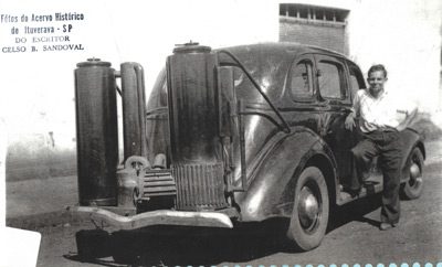 Foto de 1941, devido a crise do petróleo, os irmãos Toninho e Amadeu Caligher (na foto), fabricavam aparelhos de gasogênio, que eram abastecidos com gás natural veicular (GNV), acondicionando-os em automóveis, caminhões e jardineira