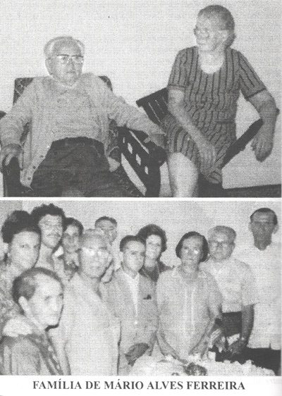 Família Alves Ferreira. Os patriarcas, Mário Alves Ferreira e Maria Constância de Jesus Alves Ferreira. São seus filhos: Edson Alves Ferreira, e a esposa Eunízia Cassiano Alves Ferreira (“Dona Nenzinha”); Eurico Alves Ferreira, casado com Maria Inês Bernardes Ferreira, Francisco Alves Ferreira (“Nenê), casado com Almira de Paula Alves Ferreira, Milton Alves Ferreira e a esposa Maria Aparecida Jacob Alves Ferreira e Aparecida Alves Ferreira Aquino de Oliveira e o esposo José Aquino de Oliveira, e Anita Alves Ferreira Barbosa, irmão de Mário Alves Ferreira (todos falecidos)