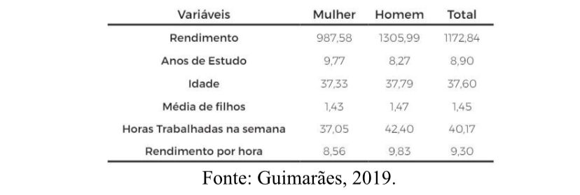 GUIMARÃES, Pedro Meirelles Nemrod. Desigualdade Salarial entre Homens e Mulheres: Uma análise econométrica de 2009–2015 no Brasil. Brasília. 2019. Disponível em:https://bdm.unb.br/bitstream/10483/26255/1/2019_PedroMeirellesNemrodGuimaraes_tcc.pdf