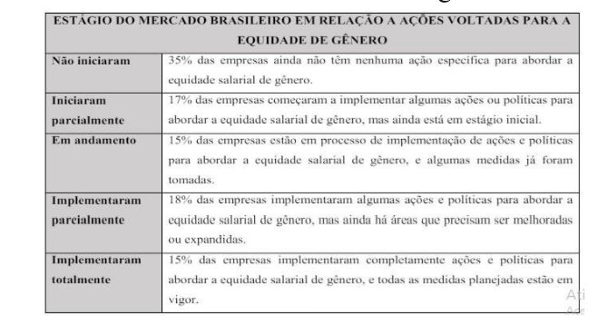 São promovidas campanhas de conscientização, bem como realizados treinamentos e workshops, com o intuito de sensibilizar tanto empregadores quanto funcionários sobre a importância de garantir salários justos e equitativos. Contudo, conforme destacado por Almeida em pesquisa conduzida pela Forbes, “apenas 15% das empresas estão efetivamente implementando medidas para promover a igualdade salarial entre homens e mulheres, enquanto 35% das empresas no Brasil ainda não adotaram nenhuma ação específica para abordar a equidade de gênero e as disparidades salariais” (Almeida, 2023).