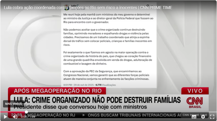 “Não podemos aceitar que o crime organizado continue destruindo famílias, oprimindo moradores e espalhando drogas e violência pelas cidades. Precisamos de um trabalho coordenado que atinja a espinha dorsal do tráfico sem colocar policiais, crianças e famílias inocentes em risco”, disse Lula.