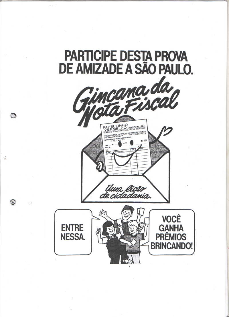 Ainda em 1992, o projeto foi colocado em prática com o nome de Gincana da Nota Fiscal, mas sofreu algumas mudanças em relação ao projeto original. Na ocasião, o regulamento da campanha continha a seguinte explicação: “Basta você juntar as primeiras vias de 10 Notas ou Cupons Fiscais emitidos a partir de agosto de 92, colocar num envelope com seu nome e endereço, e depositar numa das urnas que estão nas escolas estaduais”.